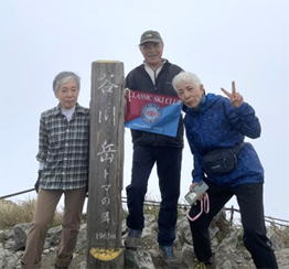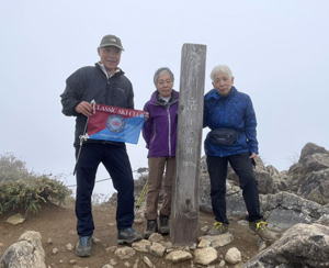 霧に包まれた谷川岳の頂で、達成の喜びをクラブ旗とともに。